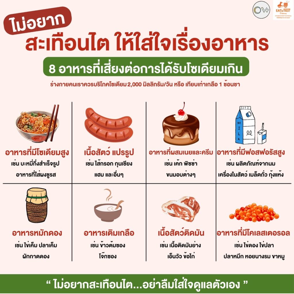 ผู้ป่วยโรคไตจำเป็นต้องควบคุมอาหารอย่างเคร่งครัด โดยเฉพาะการจำกัดปริมาณโซเดียมเพื่อลดภาระการทำงานของไต ภาพนี้ได้สรุป 8 อาหารที่ควรหลีกเลี่ยงเพื่อไม่ให้ได้รับโซเดียมเกินกว่าที่ร่างกายต้องการ ซึ่งสำหรับคนทั่วไปแล้ว ร่างกายไม่ควรบริโภคโซเดียมเกิน 2,000 มิลลิกรัม/วัน หรือเทียบเท่าเกลือ 1 ช้อนชา